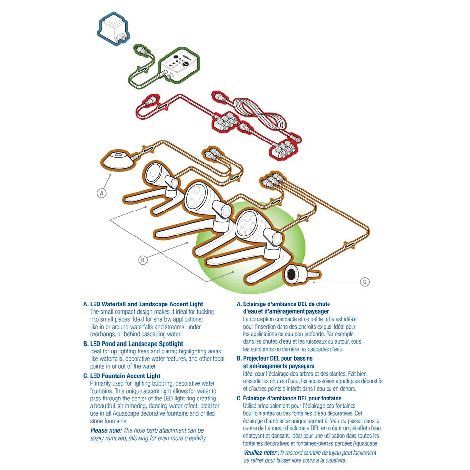 Aquascape LED lighting fixtures are extremely energy efficient, minimizing energy costs and providing a 90% savings over comparable halogen lighting. The fixture features three powerful LED diodes equivalent to a 50-watt halogen light. The die-cast metal housing with a protective coating provides a durable finish that holds up in all weather conditions. Lights are permanently sealed and water tight, and they can be installed fully submerged in water or in traditional landscape settings.