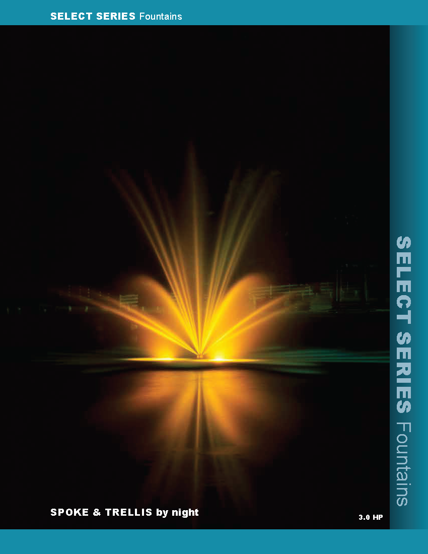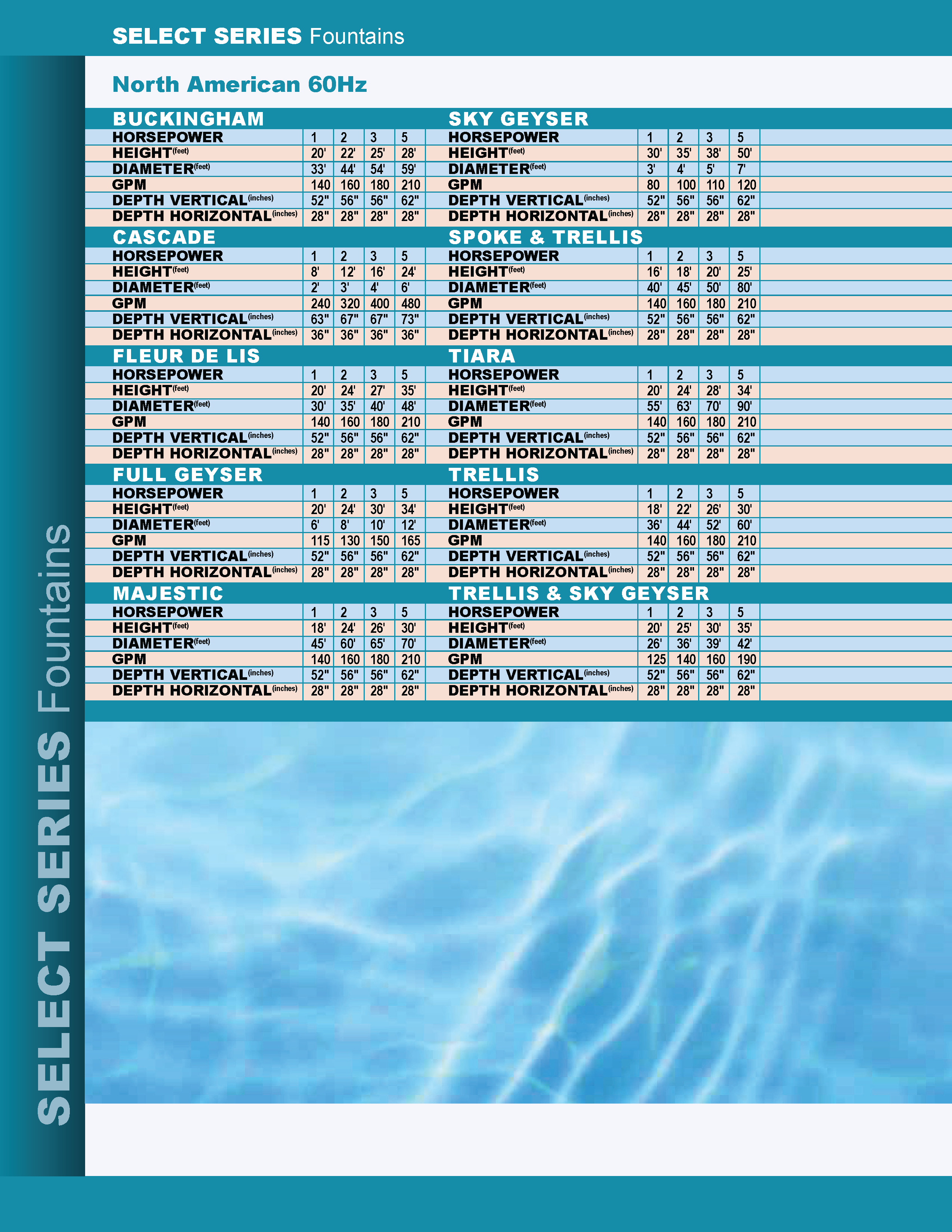 These nozzles are designed for use with the Aqua Control 5HP Select Series Fountain. It can be interchanged with other nozzles, but only those compatible with this particular fountain. Images display the available patterns for this fountain, though the horsepower may vary. The final images illustrate the dimensions of all available spray patterns.