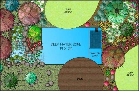 - Builds 19’ x 24’ deep water zone with a 10’ x 22’ wetland filter and 7’ x 10’ intake bay