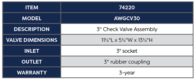 Atlantic's AWGCV30 is an asymmetrical valve body that fits vertical pumps with little lateral clearance. Its rubber coupling simplifies and valve removal or servicing, maintenance and winterizing. It can be extended to any height using 3" Sch40 pipe and fittings. It has a full flow flap that's designed to reduce friction loss and increase flow. The AWGCV30 has valve dimensions of 11.5"L x 5.5"W x 13.5"H with a 3" socket inlet and 3" rubber coupling outlet. It has a 3-year warranty.