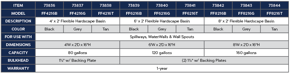 Atlantic Flexible Hardscape Basins are the easiest way to waterproof your block installation. Reinforced 28mil PVC construction with fold out flaps and punched glue points anchor liner under capstones for security and durability. Unlike improvised EPDM liner basins, welded corner construction eliminates folds and wrinkles for a neat professional appearance. Basins are available in tan, grey and black to complement any surround up to eight-feet wide. Inlcudes backing plates and bulkheads for submersible or external pumps. Use Cord Seal Fittings to pass cords. Perfect for Atlantic's Spillway, WaterWall and Wall Spout installations. Open basins not recommended for Colorfalls applications.