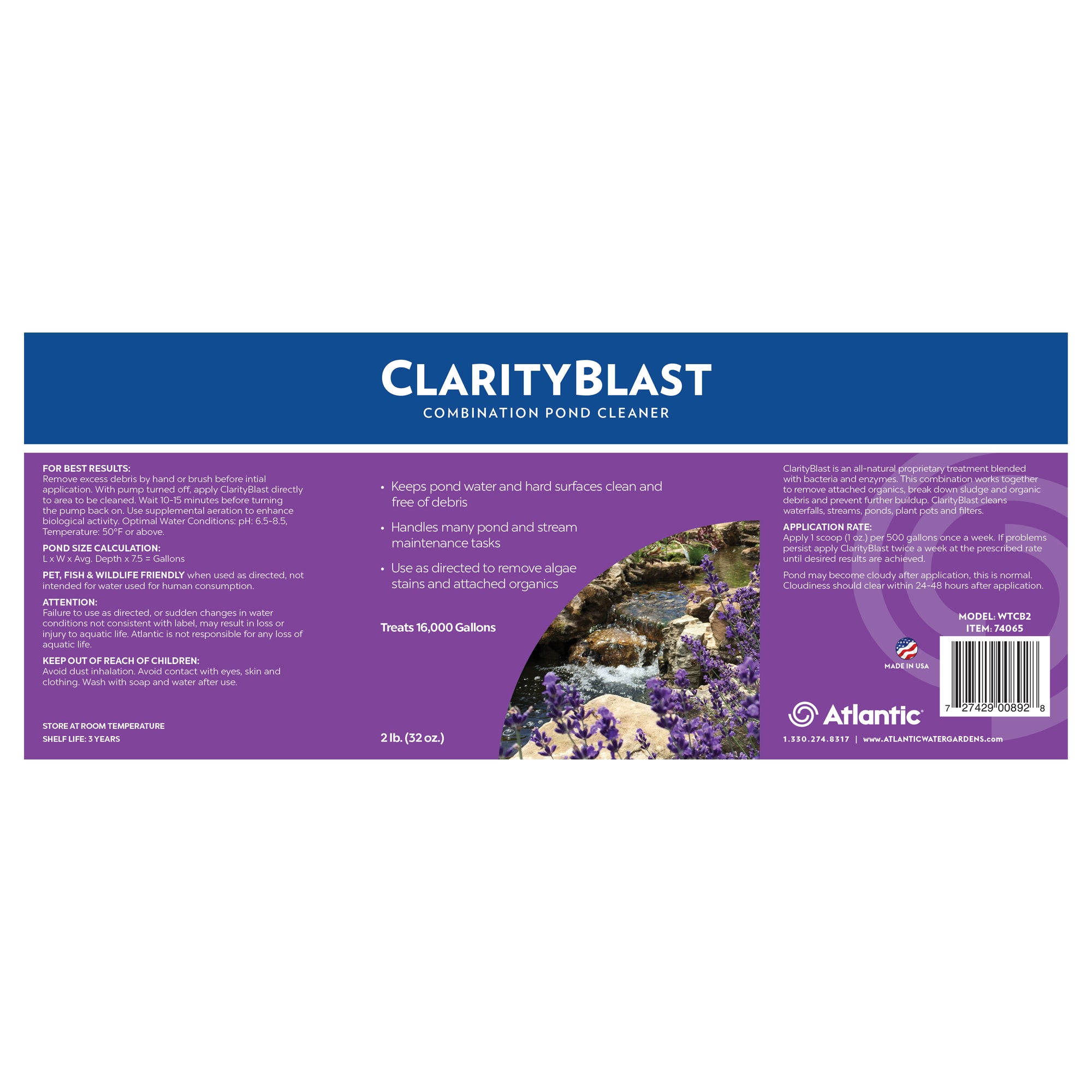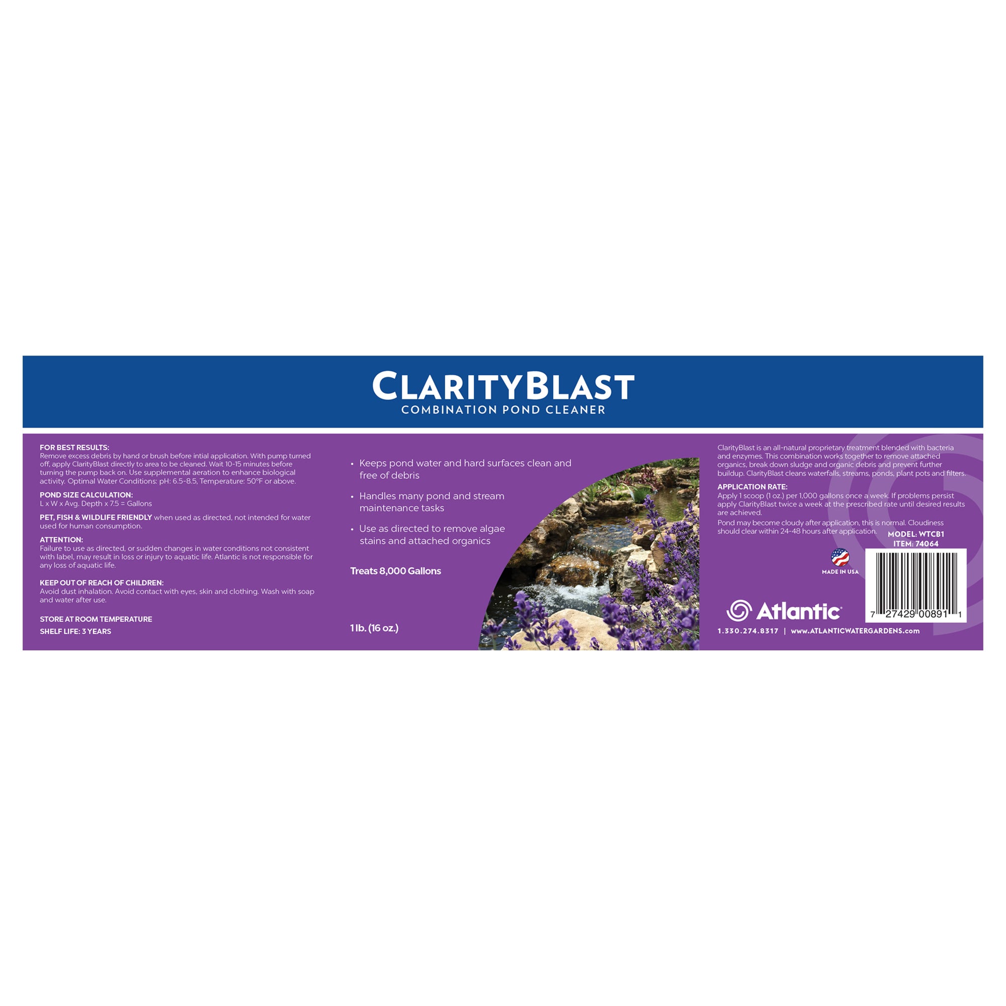ClarityBlast pond cleaner cleans waterfalls, streams, ponds, plant pots and filters. Atlantic’s ClarityBlast is an all-natural proprietary treatment with bacteria and enzymes. It keeps pond water and hard surfaces clean by removing attached organics. Use it as directed to remove algae stains and attached organics.