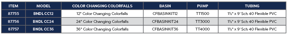 The BNDL CC24 includes a 24" Color Changing Colorfalls, CFBASINKIT24 and TT3000 pump.