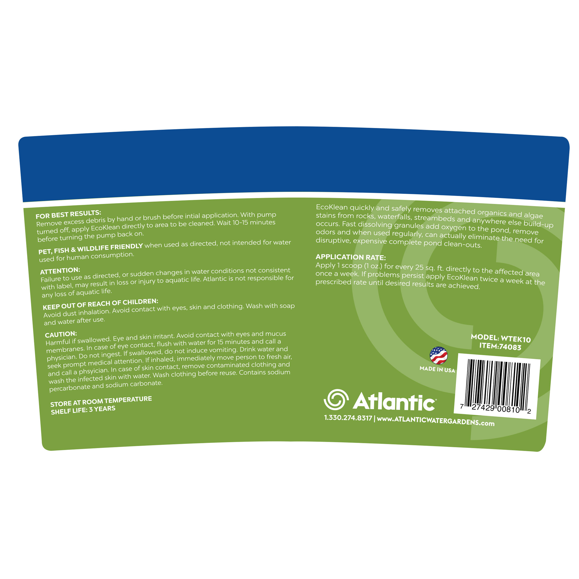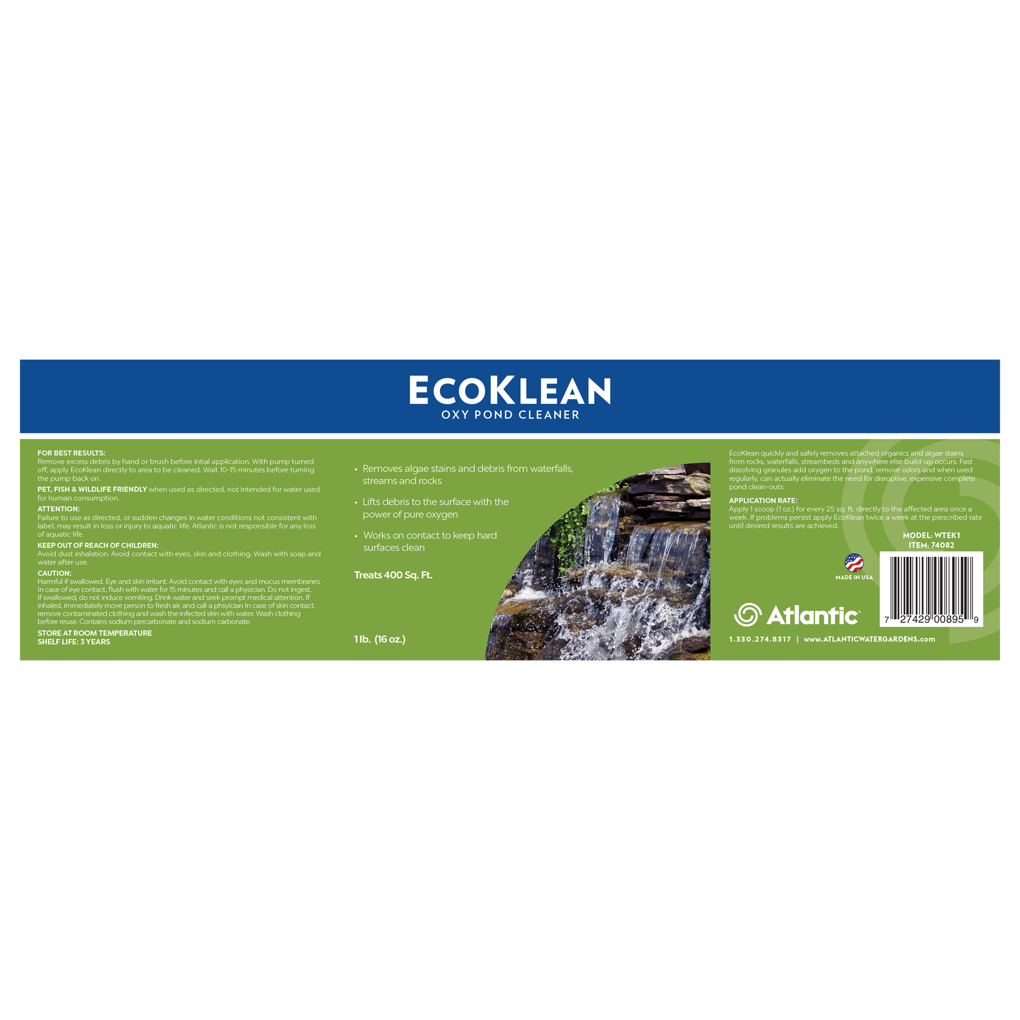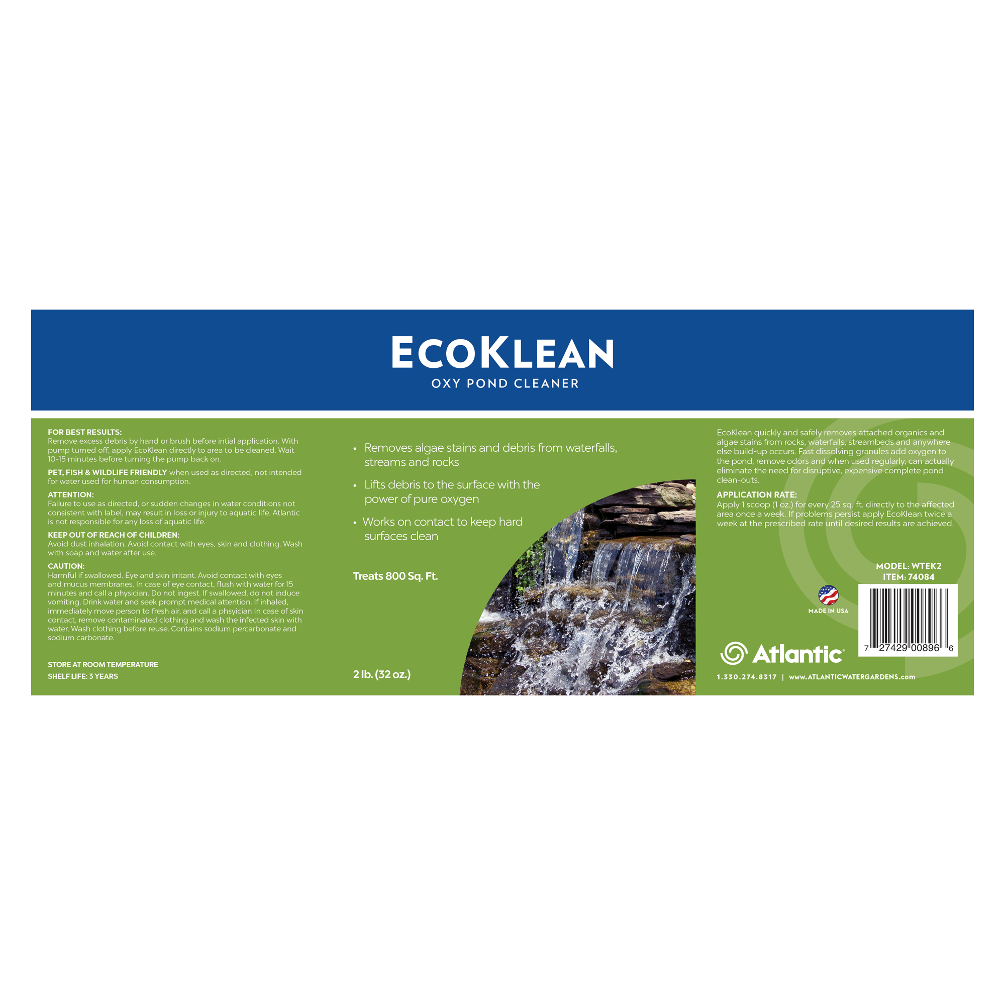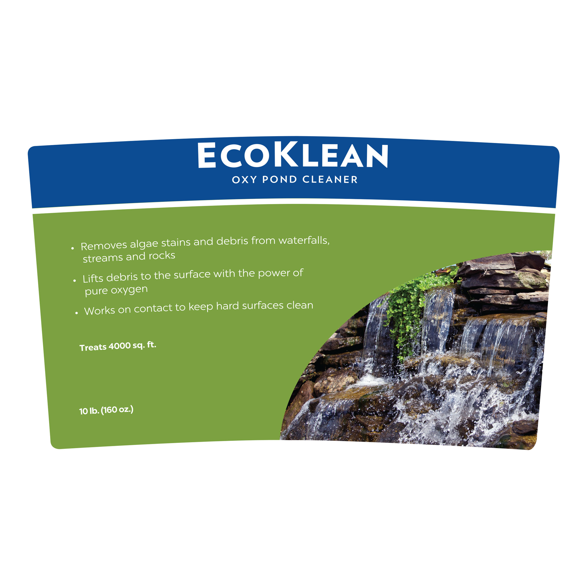 EcoKlean oxy pond cleaners quickly remove attached organic and algae stains from rocks, waterfalls and streambeds. Atlantic’s EcoKlean fast dissolving granules lift debris to the surface with the power of pure oxygen. Regular use of EcoKlean may eliminate the need for disruptive, expensive pond clean-outs. Use it as needed to keep hard surfaces clean and free of attached organics.