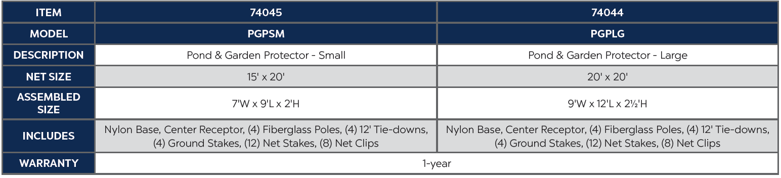 The Pond and Garden Protector elevates the netting to keep leaves and other wind blown debris out of your pond or garden. It has a domed design which allows pond and garden plants to grow unobstructed under the netting. UV-resistant poly netting extends usable life. 0.5” x 0.5” openings protects fish from heron and other predators. The Pond and Garden Protector helps prevent algae growth in your pond by reducing organic waste that can enter your pond. It helps keep out rabbits, deer and other herbivores to protect your garden during the growing season.
