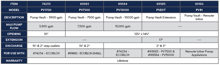 Atlantic’s pump vaults house and protect the pumps and plumbing of underground water storage and circulation systems. Atlantic’s newly redesigned Pump Vaults occupy the same footprint as Eco-Blox for simplified installation within a rectangular basin. The vaults are rotomolded of virtually indestructible polyethylene for long, worry-free service. They have an extremely strong low profile vault lid that fits all sizes, support gravel and foot traffic and can be removed without gravel falling in. The flat panels accommodate up to 3" plumbing and auto fills. Either slotted side of Vault handles double the rated flow so one side can be blocked by liner without effecting capacity. The pump vault extensions increase the height of the vault in deeper, larger basins, with each extension the height of one Eco-Blox. All Vaults accommodate two or more pumps for versatility. The remote Pump Vault allows submersible pump location outside of lined reservoir. The PV15000 has a maximum pump flow fo 15,000 GPH and has an opening of 12.25” x 14.75”. The PV15000 has a discharge of 2” and 3” and is best used with the ECOBLOX. It has a lifetime warranty.