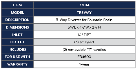 The Triton 3-Way Diverter works with the FB4600 Fountain Basin to provide individual flow control to multiple fountain pieces without having to access the pump inside the pump chamber
