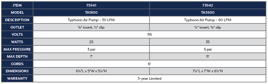 The TA1800 has a 0.75” insert and 0.50” slip outlet, with maximum pressure of 3psi and a maximum depth of 7’. It has a 6’ cord, dimensions of 6.25”L x 5”W x 5.25”H and a 3-year limited warranty.