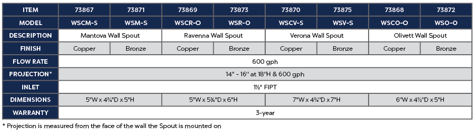 • Wall Spouts are an easy and elegant way to add the sight and sound of water to vertical surfaces