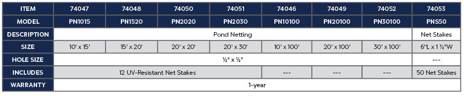 Atlantic’s Netting keeps out leaves and other wind blown debris for a clean pond in the fall and spring. Its durable poly netting is UV-resistant for an extended lifespan. Its physical barrier also protects fish from heron and the predators. Netting your pond helps reduce organic waste that can fuel algae growth and reduce oxygen levels. 0.5” x 0.5” openings keep out smaller windblown debris. With 4 pre-cut, 3 roll sizes and sizes ranging from 15-100 feet, it’s fit for most water feature designs. The new stake design is longer with a larger diameter head for improved net retention.