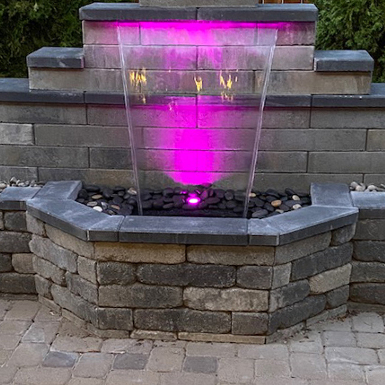 The Basin Kit for Large Formal Falls was designed to create an easy way to install a pondless waterfall feature within a block wall structure indoors or outside with a maximum height of 24". The basin can be sunk in-ground or used above ground and comes equipped with dual pump access through an access panel located just under the splash mat. Additionally, if you are looking to install an autofill to maintain the water level, a pre-installed spinweld located on both the left and right makes installation fast and easy. Included in this kit are 2 LED color Lights with Remote.