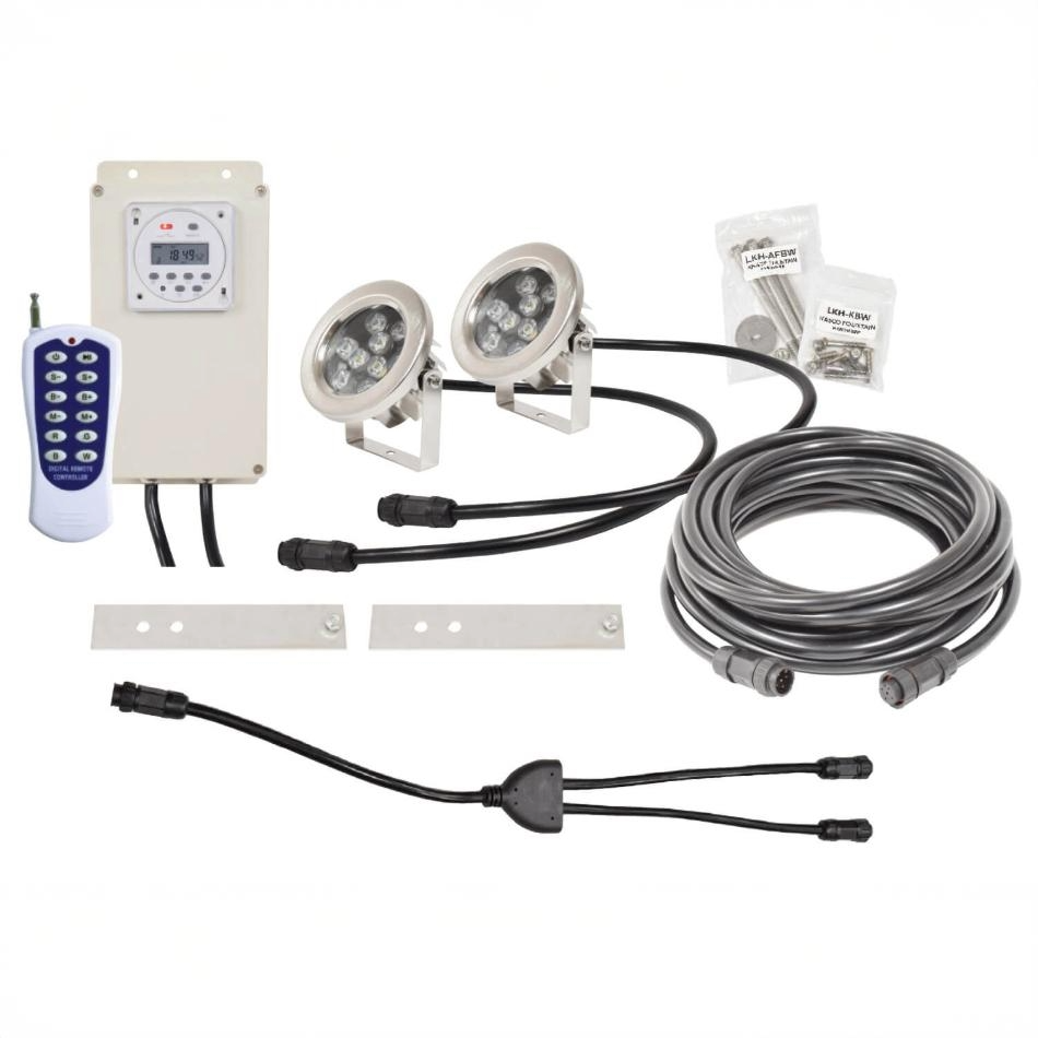 Kit includes: Two fixtures, two mounting brackets, 2 x 1 splitter cord, controller/timer, remote control, hardware and cord