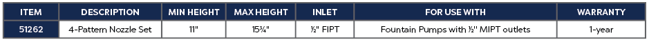 The OASE 4-Pattern Nozzle Set creates a decorative display of water in small reservoirs and connects directly to Fountain Pumps with 0.5" MIPT outlets. OASE's 4-Pattern Nozzle Set aerates and decorates ponds, fountains and containers. The Diverter valve has an adjustable flow control which allows for separate circulation of the reservoir while the fountain nozzle is operating. The 4-Pattern Nozzle Set features a telescoping nozzle, diverter valve, flow control and 4 different heads that are easily interchangeable.