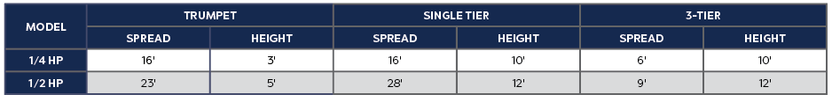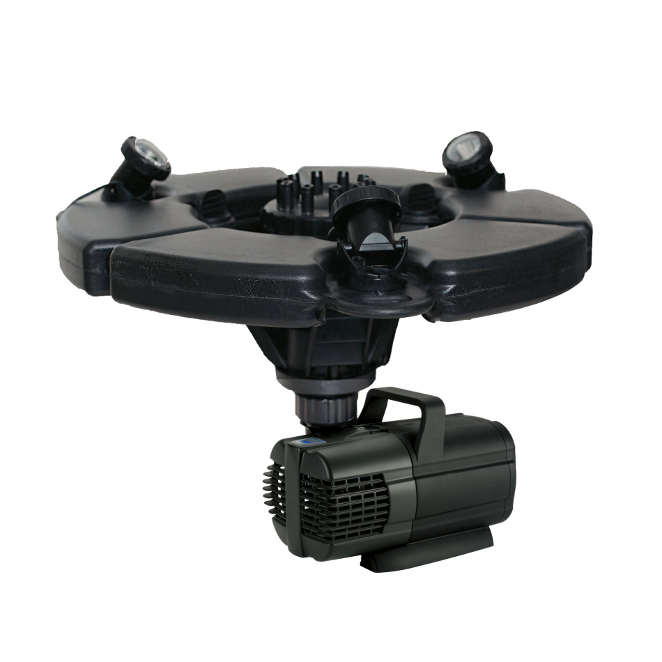 OASE’s Floating Fountains offer an economical shallow water aeration, combined with an attractive visual display. The Floating Fountain with Lights are compact, reliable and energy efficient and they come complete and ready to connect right out of the box! They are designed for use in smaller water features with a minimum depth of 30”, with dimensions for the 1/2 HP at 23”W x 16.75”H. The 3 LED spotlight illumination set brings the various water patterns to life after dark via optional photocell. With 3 ornamental nozzle attachments to choose from; Trumpet, Single Tier and 3-Tier, you’ll be amazed both day and night! The Trumpet Nozzle has a max size of 23'W x 5'H and is adjustable. The Single Tier Nozzle is 28'W x 12'H. The 3-Tier Nozzle is 9'W x 12'H. The grounding plate eliminates any chance of a stray current entering the water for unparalleled safety. The Floating Fountains coated magnetic rotors are impervious to adverse water conditions. The self-cooling, debris flushing rotor chambers help keep the pumps from overheating in the most demanding applications. With a tool-less volute removal, it makes maintenance fast and easy! The Nylon jacket on power cord keeps the line from tangling. The Floating Fountain with Lights includes a pump, float body, mooring lines, pump shield, stainless steel mooring anchors, lights and 3 nozzles.