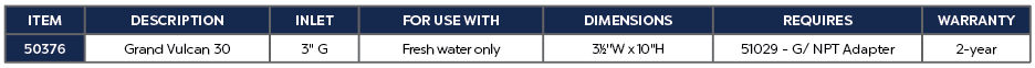 The OASE Grand Vulcan 30 is a multi jet nozzle whose clear single jets resist wind deflection. The circular arrangement of the jets maintain a consistent height with one another. The Grand Vulcan 30 is intended for fresh water only and is water level independent.