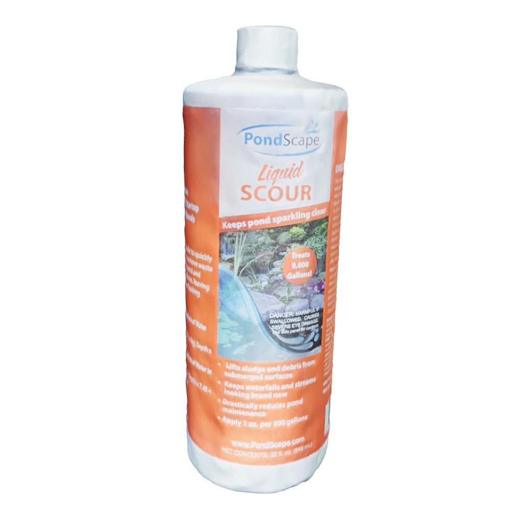 HOW TO APPLY: Use 1 oz. per 300 gallons of water. Turn off pumps when treating streams or waterfalls. Use 1 ounce of Liquid Scour for every 300 gallons of water. Can be applied directly to the pond. Product can be mixed in a bucket of pond water to evenly spread around pond or fountain. For best results apply in the morning under sunny, calm conditions. Applications can be repeated every 3 days until desired results are achieved. Ensure pond is equipped with a mechanical skimming device or remove the excess debris with a fine net the next day after treatment.
